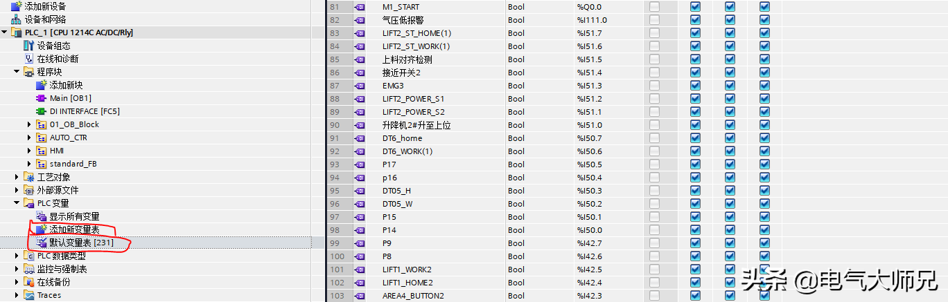 首先,前面的文章和视频也提过,做项目的一个流程,工艺过程、选型、等我们今天就略过,我们先从做符号表开始,如下图所示,可以在默认变量表里编写地址和符号,也可以新建多个变量表,把变量进行分类,方便查询和使用建立符号表