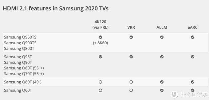 值得一提的是三星2020年新款电视对HDMI 2.1接口的支持非常复杂,同型号不同尺寸也会有不同,具体请见下表,真的不知道三星是怎么想的。
