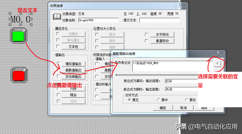 组态好的按钮和指示灯可以通过颜色显示状态之外,还可以通过工具箱的文本用“打开”或者“关闭”的文本标识状态。