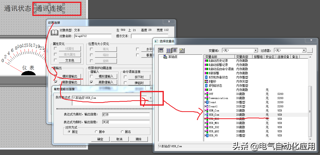 此外,我们再建立一个文本并关联通信状态变量USB_Com,以便我们在人机界面运行时可以判断通信是否正常。