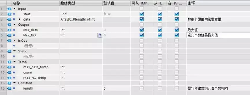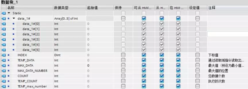 添加一个全局DB块,并在DB块中建立一个变量名为data_1#,数据类型为数组的变量,用于存储需要找出最大的数据,同时建立一些相应的变量,如下图所示。