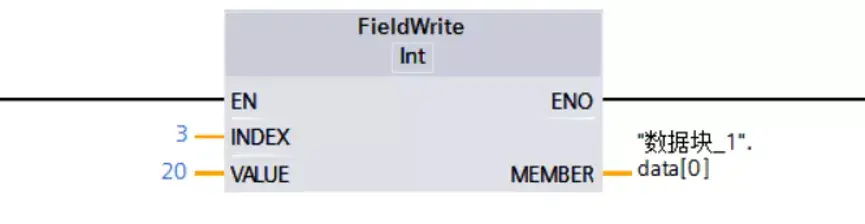 表示把数据20写入到数据块1中的变量名为data的数组中的data[3]元素的存储器中。
