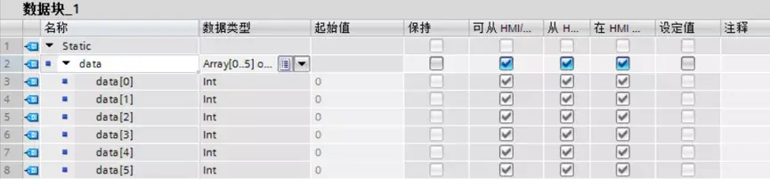 添加一个全局DB块,在全局DB块中建立一个变量名为Data的数组,元素个数可以视情况进行设置。如下图所示,元素个数设置为5个。