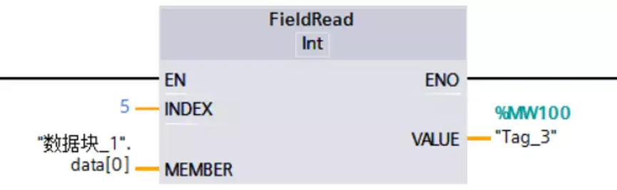 先以大家相对来讲比较熟悉的梯形图的方式来实现此功能。这里我们需要用到通过读取域或写入域的指令,该指令根据索引的下标值来读取数值中相对应元素的值或写入数到数组中相对应的元素里。此例子中只需要用到读指令,指令位于移动操作指令中的“原有”文件加中。