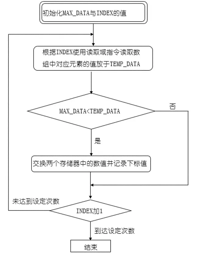 本例题要去找出最大值,并把最大值所处的位置记录下来,编程思路:假设变量MAX_DATA作为最大值的存储器,然后根据下标值(INDEX)的多少去读取相应数值中对用的元素的值放于TEMP_DATA变量中,然后与MAX_DATA做比较,若MAX_DATA的值要小,则进行交换,同时记录INDEX值。然后INDEX加1,可以指向数组中的下一个元素