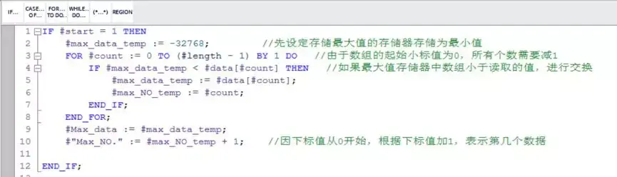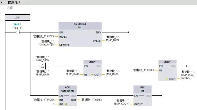 编写读取数组中元素的值,然后与存储最大值的存储器中的值做比较,用于判断数据存储器存储的值是否是最大值,若不是最大值进行数据交换,同时记录位置,然后INDEX的值加1,同时记录执行次数并与设定次数做比较,如未达到设定次数,则跳转换前面继续通过Field Read指令读取数据出来继续做比较。