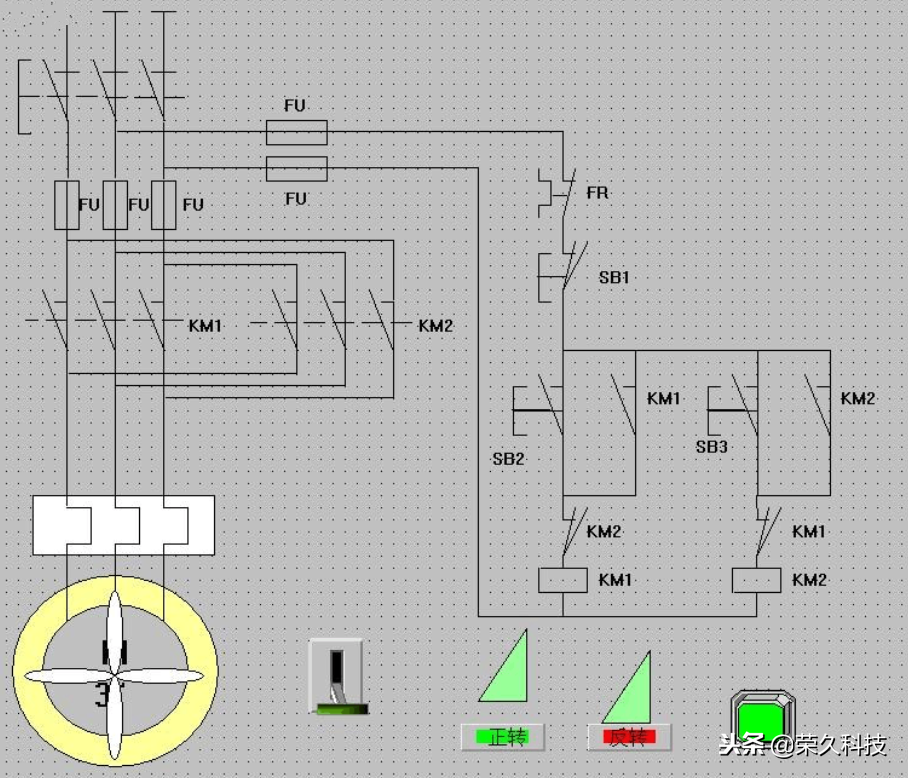 2 画出电动机的正反转控制电气原理图,并且以组态王的动画形式表现。