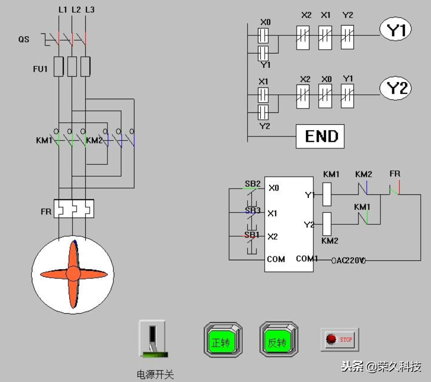 正反转的控制面板。控制面板上设有总的断路器、停止、正转、