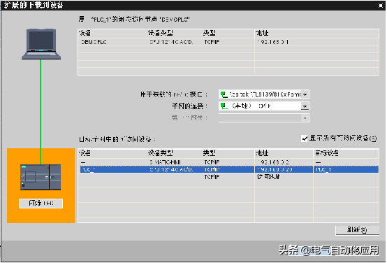 打开“扩展的下载到设备”对话框,勾选“显示所有可访问设备”,若已将编程计算机和PLC连接好的话,将显示当前网络中所有可访问的设备