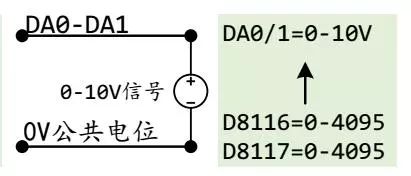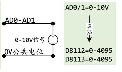 模拟量输入(0V为输入基准电压)AD0输入0-10V信号对应D8112=0-4095数值AD1输入0-10V信号对应D8113=0-4095数值D8080‐D8081是AD0/AD1的滤波寄存器,数值1‐2000,默认数值1000。