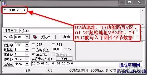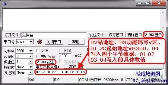 我们用电脑向S7-200PLC发送一组数据修改S7-200PLC中的VB300、VB301、VB302、VB303数据最终使VB300 = 01、VB301 = 02、VB302 = 03、VB303 = 04。