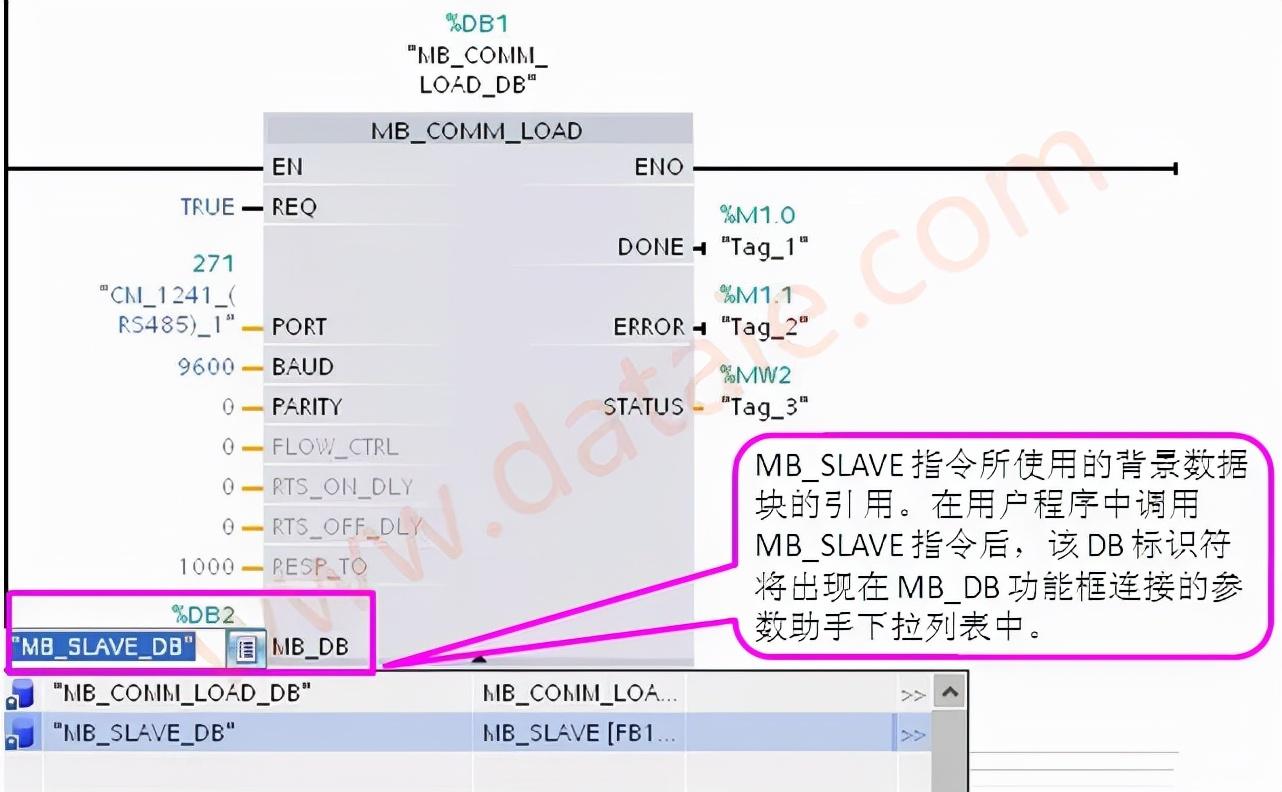 对 MB_MASTER 或 MB_SLAVE 指令所使用的背景数据块。