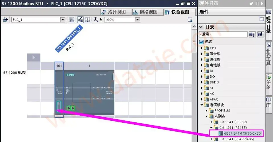 在硬件目录里找到“通信模块”→“点到点”→ “CM1241(RS485)”,双击或拖拽此模块至CPU左侧即可,如下图1所示: