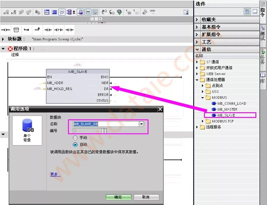 程序中不存在“MB_SLAVE”指令的输入引脚“MB_HOLD_REG”对应的DB块。在创建“MB_SLAVE”指令的输入引脚“MB_HOLD_REG”对应的DB块时选择了“仅符号寻址”。解决方法分别如下: