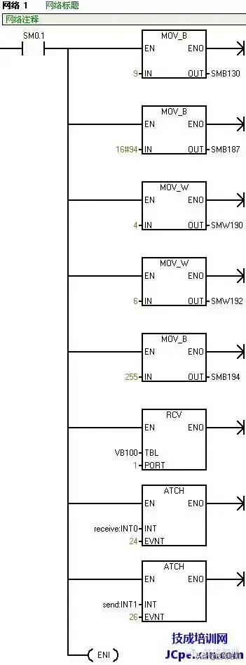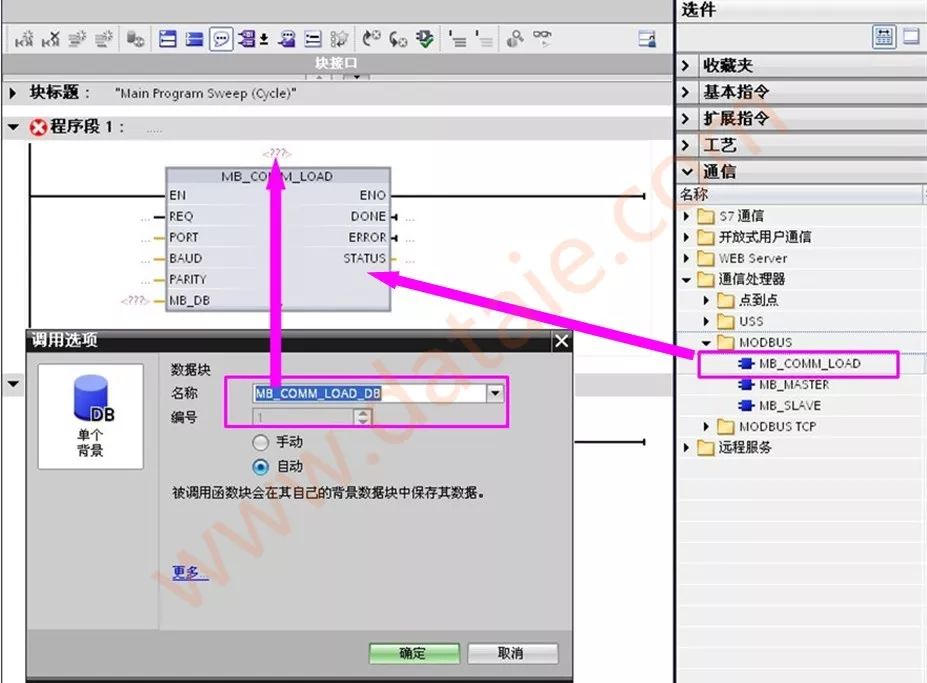 注意: “MB_COMM_LOAD”指令输入位“REQ”需使用上升沿触发。由于OB 100只在S7-1200启动时执行一次,因此,此例中将“REQ”设为“TRUE”。