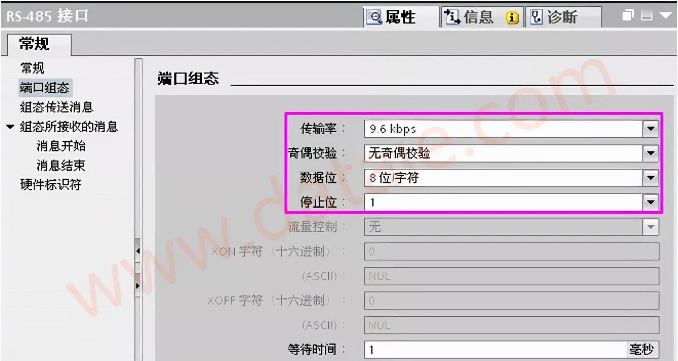 以下以传输率=9.6Kbps,奇偶校验=无奇偶校验,数据位=8位字符,停止位=1,其它保持默认设置为例。