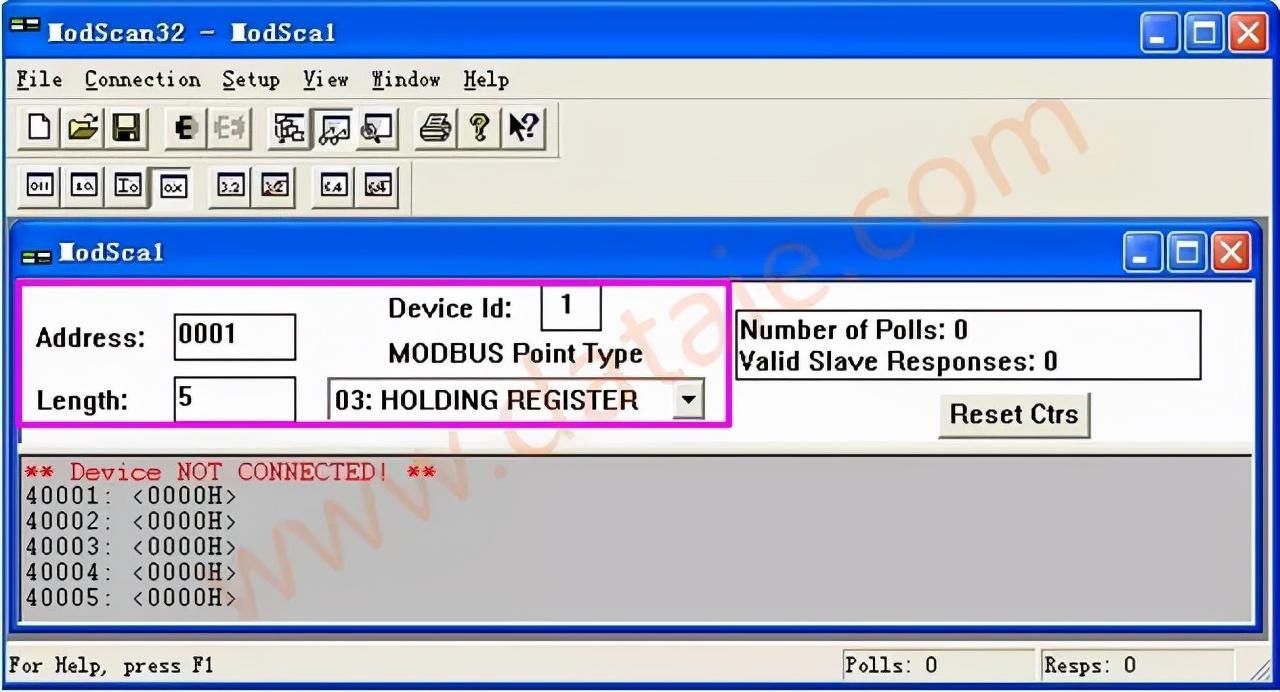 选择“File”→ “New” 打开ModScan通信界面,设置Modbus RTU从站的地址Device Id=1,数据开始地址Address=0001,数据长度Length=5,Modbus数据类型功能码03,如下图11所示: