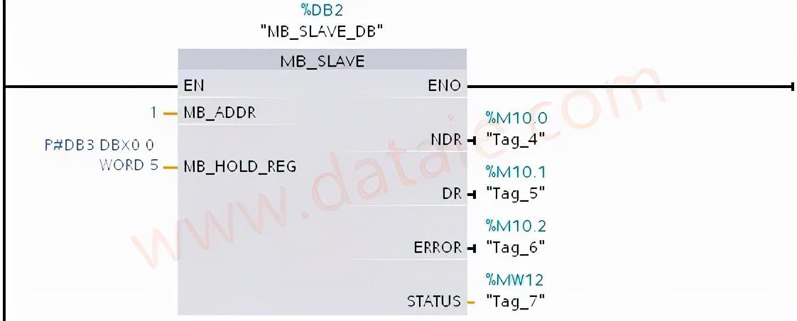 S7-1200作为Modbus RTU从站,MB_HOLD_REG指向Modbus保持寄存器数据块的指针。设置如下所示:MB_HOLD_REG=P#DB3.DBX0.0 WORD 5。