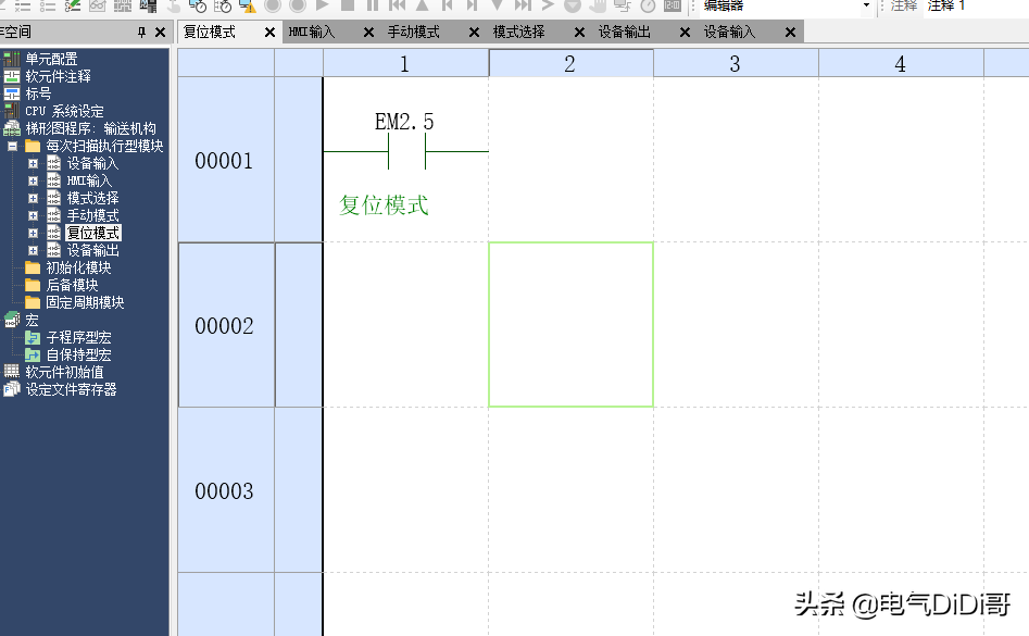 模式选择是要进行程序切换的,不同的模式对应不同的程序,在手动模式下的程序只有在手动模式下才起作用,这一章我们来写复位模式,复位模式是要把所有不在原来位置的设备回到初始位置。