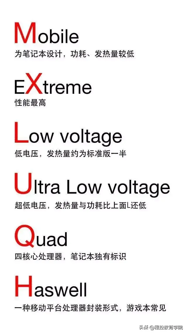 处理器型号最后的两位字母表示CPU的工作电压,如下图所示: