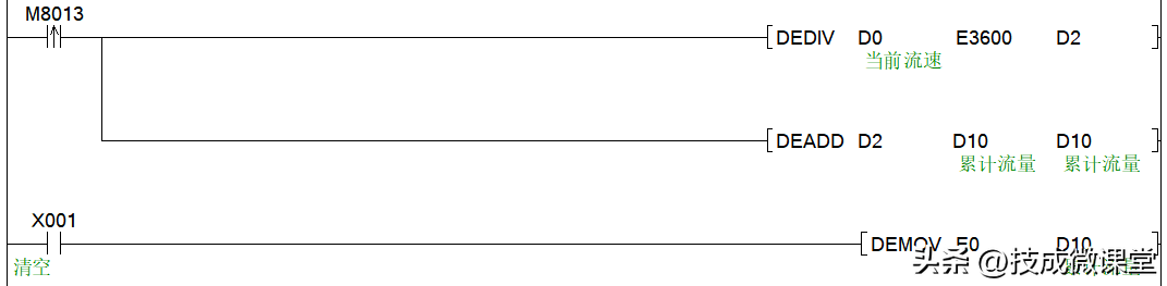 M8013每隔1s导通1次,做个加法累加一次,得到的就是总流量,上面求出的值的单位需要转换为秒,因此需要除以3600s,得出的才是实际的流速,保存在D2,然后用加法指令去累加,得到的就是累计流量。另外设置了一个清空按钮X1,按下即可清空累计流量。