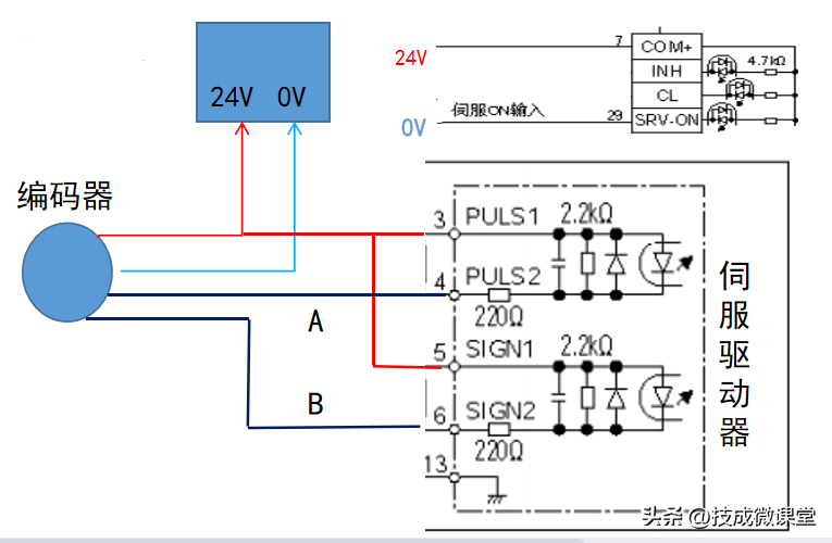 需要接入的信号有伺服使能、脉冲口A/B相,给电机驱动器7号和29号引脚一个24V,让电机上电就一直使能,编码器为NPN输出类型,给到伺服的信号为低电平信号,因此接到对于两个信号口的负端4号和6号引脚,信号的正端3号和5号直接接24V电源。