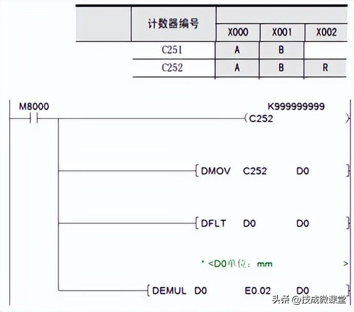 使用高速计数器C252,X0 、X1作为AB相记录脉冲位置,X2作为复位信号,这个是光栅尺里面特定的一个点,碰到了,就是自动复位C252,这个点作为原点。