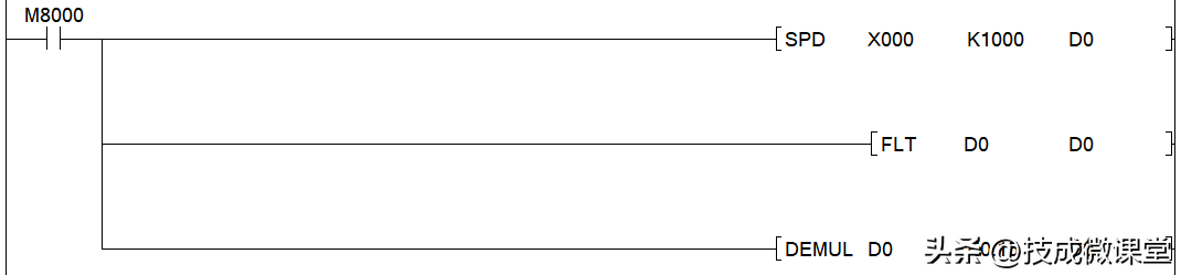 本案例只需要测量速度,没有测量距离的要求,因此可以不用高速计数器,只需要使用SPD指令(脉冲密度测量),第一个参数指定X0作为测量电,规定时间为1000ms,即1s,把每1s接收到的脉冲数读取到DO里。