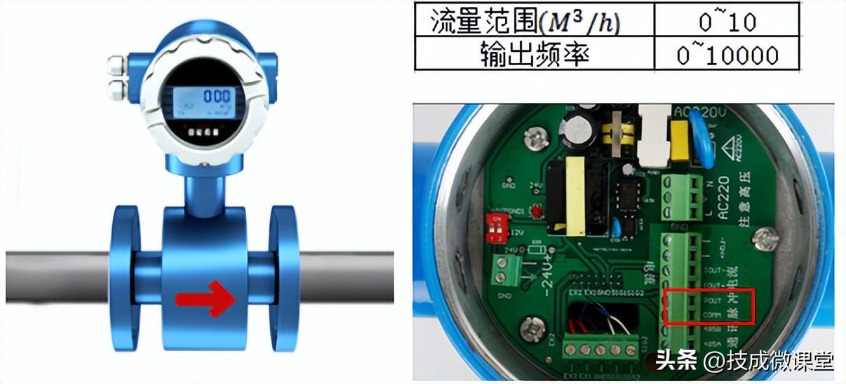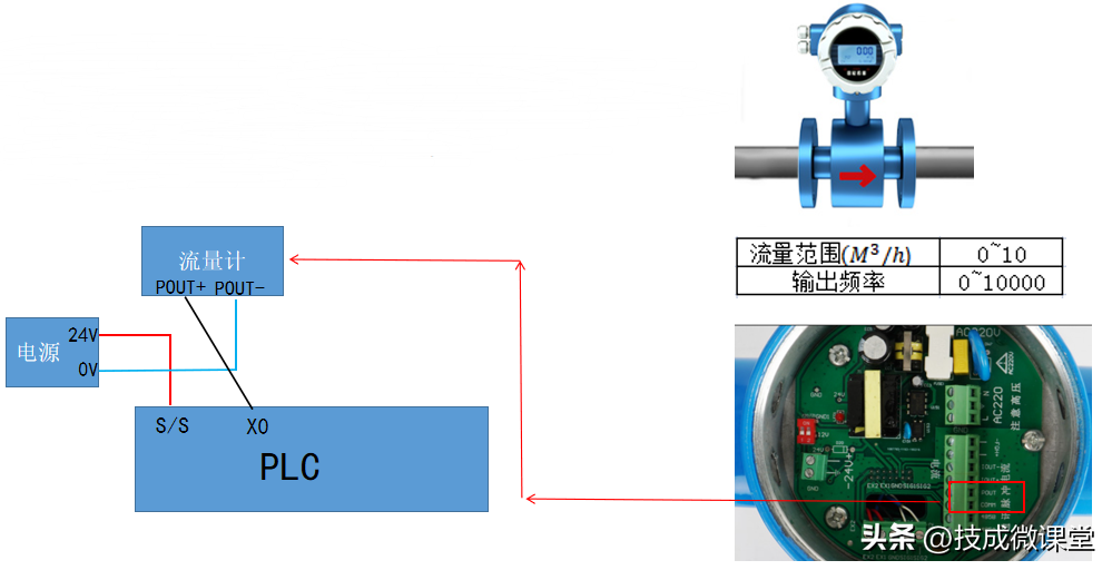 PLC公共端接入正24V,因此X点接收端的信号应为负,所以把负电压接入流量计负端,流量计正端信号接到X0即可。