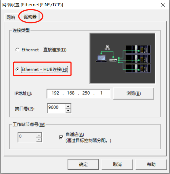 2、设置为 Ethernet - HUB连接,其中IP地址和端口号均为默认。