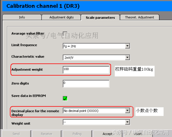 点击左侧”Calibration channel1 (DR3)”设定称重模块通道1的相关参数: