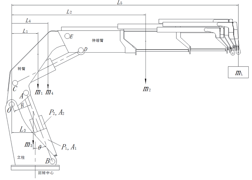 转臂、伸缩臂、第一变幅液压缸、第二变幅液压缸的自重分别为m1、m2、m3 和m4,其重心到转臂尾铰点O 在水平方向的投影距离分别为L1、L2、L3 和L4,吊载载荷的重量为mL,其重心到转臂尾铰点在水平方向的投影距离为L5,第一变幅液压缸无杆腔与有杆腔的压力分别为P1 和P2,作用面积分别为A1 和A2,其作用力方向相对转臂尾铰点的力臂为H,与竖直方向的夹角为θ,力矩平衡方程为