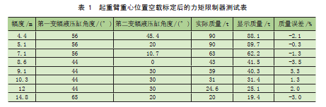 4 结论 本文研究了折臂式起重机力矩限制器的测重原理,提出了和汽车起重机不同的空载标定算法。该算法仅需要数组标定数据,即可计算出伸缩臂的自量和重心位置。将该空载标定算法应用在某型号折臂式起重机上进行试验,试验结果表明,力矩限制器在不同工况下均能够显示较高精度的吊重信息。