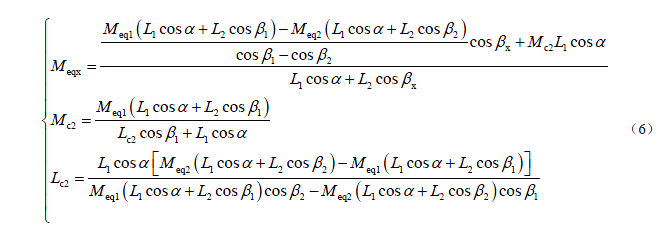 由式(6)可知,在伸缩臂长确定后,只需要进行两个点的标定可求出起重臂的质量和重心,标定有限个长度的质量和重心后,其余臂长的质量和重心可以通过线型差值的方法求出。具体的标定方法分为以下三步:1)将起重臂臂长调整为一个指定值,转臂角度和伸缩臂角度也调整为一个指定值,控制器根据传感器获得的转臂仰角α1,伸缩臂长度L2 和角度β1,计算出等效在臂头的质量Meq1。2)起重臂臂长不变,转臂角度不变,伸缩臂角度调整至另外一个指定值β2,控制器计算出等效在臂头的质量Meq2。3)控制器根据Meq1 和Meq2 以及获得的两组长度和角度数据,根据公式6 计算出起重臂的质量重心位置Mc2 和Lc2。若伸缩臂的重量已知,则直接标定重心的位置即可。