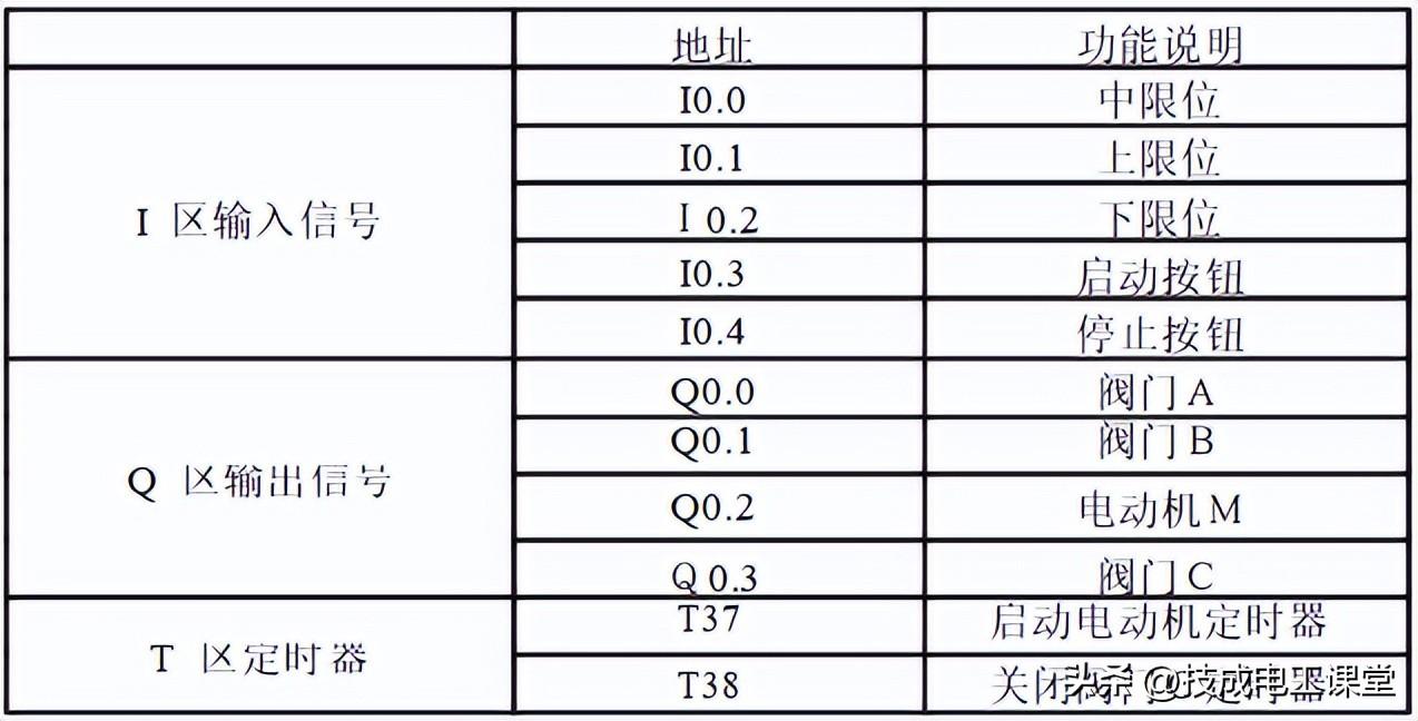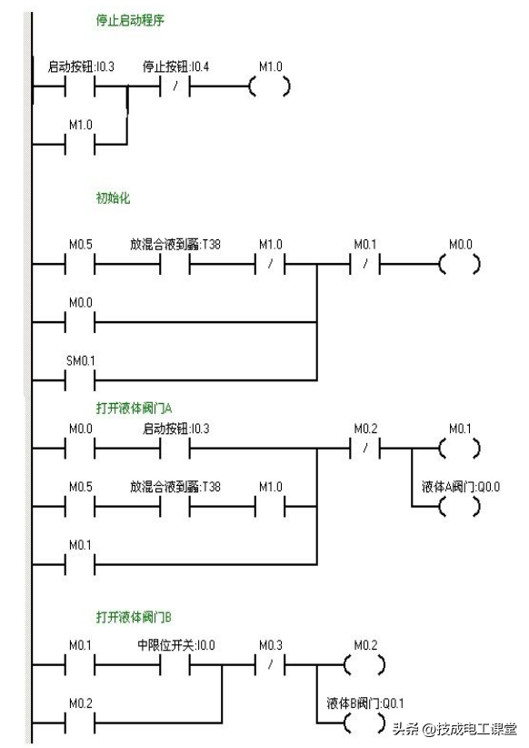 当按下在线控制面板上的I0.03f 即(I0.3闭合)阀A打开(即Q0.0亮),当按下在线控制面板上I0.0f(即I0.0中限位闭合)阀A关闭,阀B打开(即Q0.0灭,Q0.1 亮)当按下在线控制面板上I0.1f(即上限位I0.1闭合)此时阀B关闭,电动机启动开始进行搅拌,(即Q0.1灭,Q0.2亮)同时定时器T37开始定时一分钟,一分钟后搅拌机停止搅拌,阀C打开(即Q0.2灭,Q0.3亮)当液位到达下限位后阀C继续打开(即Q0.3亮)同时定时器T38开始定时。5s后阀C关闭。阀A打开,(即Q0.3灭,Q0.0亮),进入下一个循环周期。按下在线控制面板上的I0.4f(即表示停止的I0.4闭合)此时系统不会立即停止,而是当运行完一个周期后才停止。