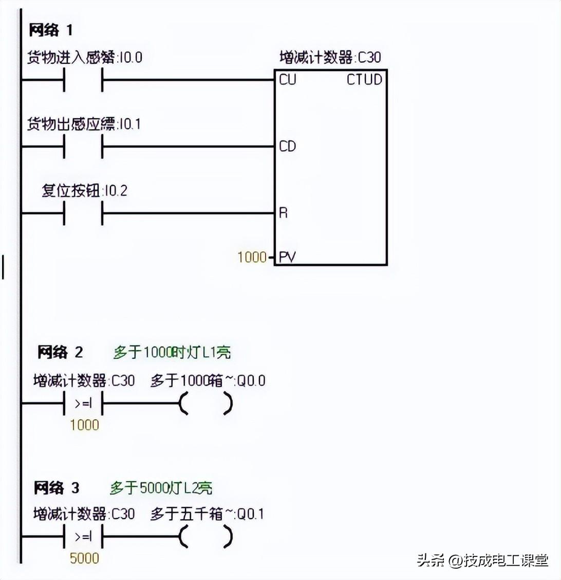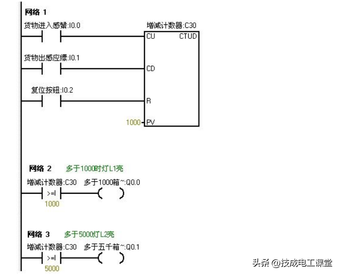 点击一次,计数器中的计数值就减少一次。当计数器中的值小于10时即表示仓库中的物品少有5000箱,此时灯L2灭(即Q0.1没有输出)当继续点击I0.1f时计数器 中的计数值继续减少,当减少到小于5次时。表示仓库中的物品少于1000,此时灯L1灭。Q0.0就没有输出。当按下在线控制面板上的I0.2f时计数器清零。L1和L2都不亮,(即Q0.和Q0.1都没有输出)。