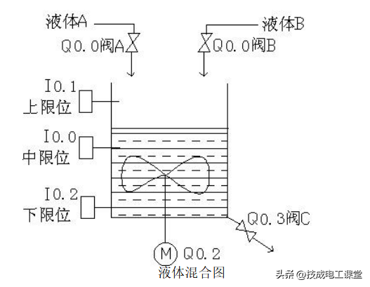 用S7-200实现液体混合的自动控制。当按下启动按钮后,液体阀A 打开,液体A流入搅拌机里面。当液位达到中限位时阀A关闭,同时打开液体阀B,液体B流入搅拌机里面。当液位达到上限位时,阀B关闭,此时启动电动机进行搅拌。搅拌一分钟后电动机停止同时阀门C打开,混合液体流出。当液位到达下限位时再过5S容器放空,关闭阀门C。同时打开阀门A,注入液体A。如此周期性的循环。若按下停止按钮后必须要等一个周期循环完后才停止。