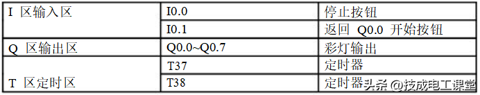 利用PLC的Q0.0到Q0.7八个输出端控制八个彩灯,使其每隔一秒亮一个并循环。当接通I0.0后所有的灯都熄灭。当接通I0.1后又重新从Q0.0开始循环。