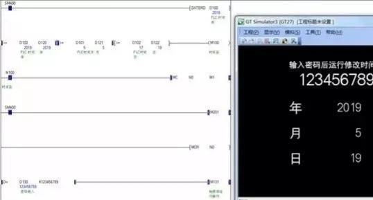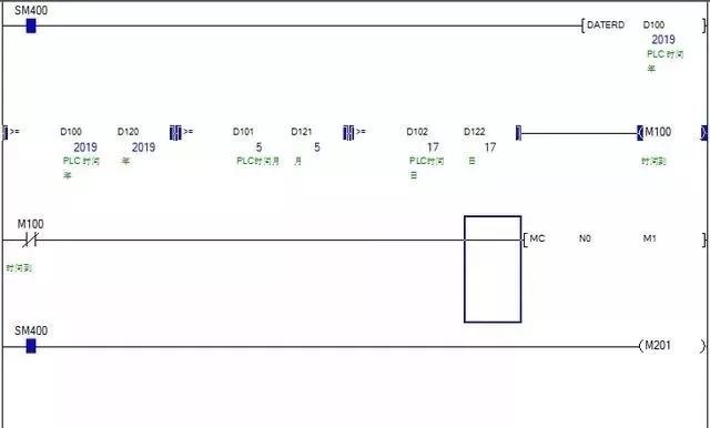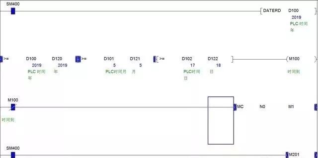 第二种下面D100-D102是读出的PLC系统时间,D120-D122是我们设置的数据年,月,日,现在是设置的2019.5.18号停止,目前是17号M100未通,主控程序可以运行,M201输出