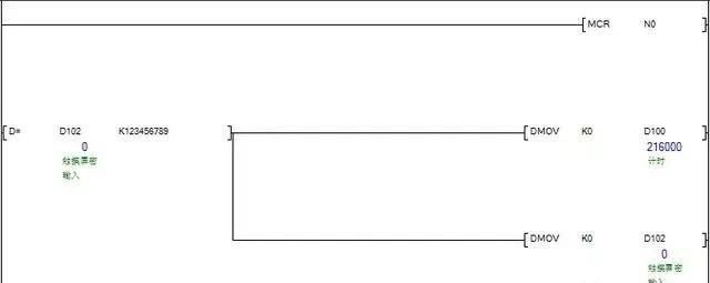 当我们输入123456789(随意设置的密码)时就清零D100的计数,M100断开,又回到从零开始计时。