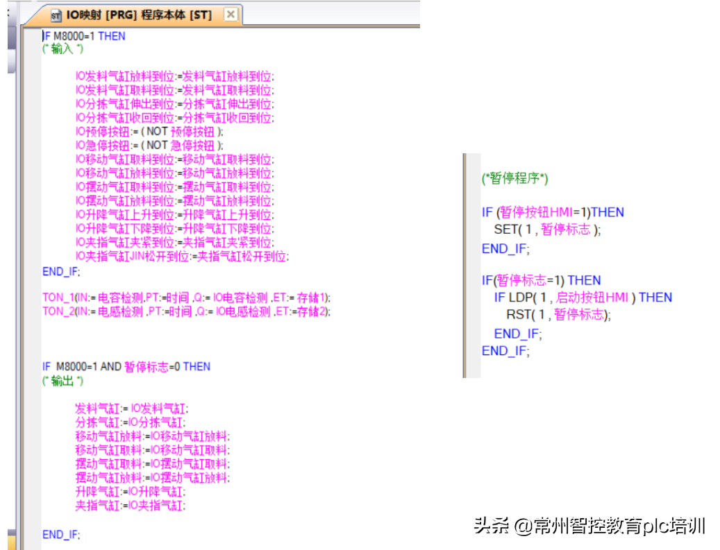 注意:这些“0/1标志位”的建立,是为了ST语言程序在设备动作中,存储设备的动作完成信号、物料判别信号、系统中断信号、下一步动作许可信号等程序数据。