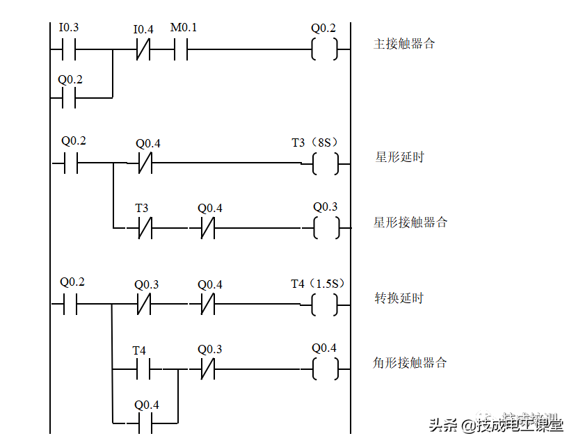 当电梯确定好运行方向(向下运行)后,运行接触器Y12吸合,给轿厢提供一个预转矩防止电梯因重力作用倒溜。经过时间继电器T0设定时间后,Y13输出(抱闸接触器吸合)打开抱闸,经过时间继电器T1设定的时间后,Y1输出(给变频器下行使能信号),Y2、Y4输出(给变频器频率信号),电梯启动运行。