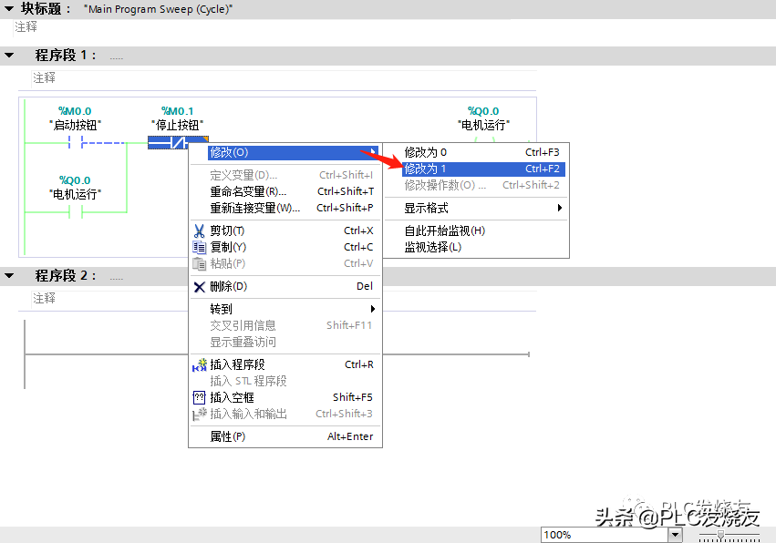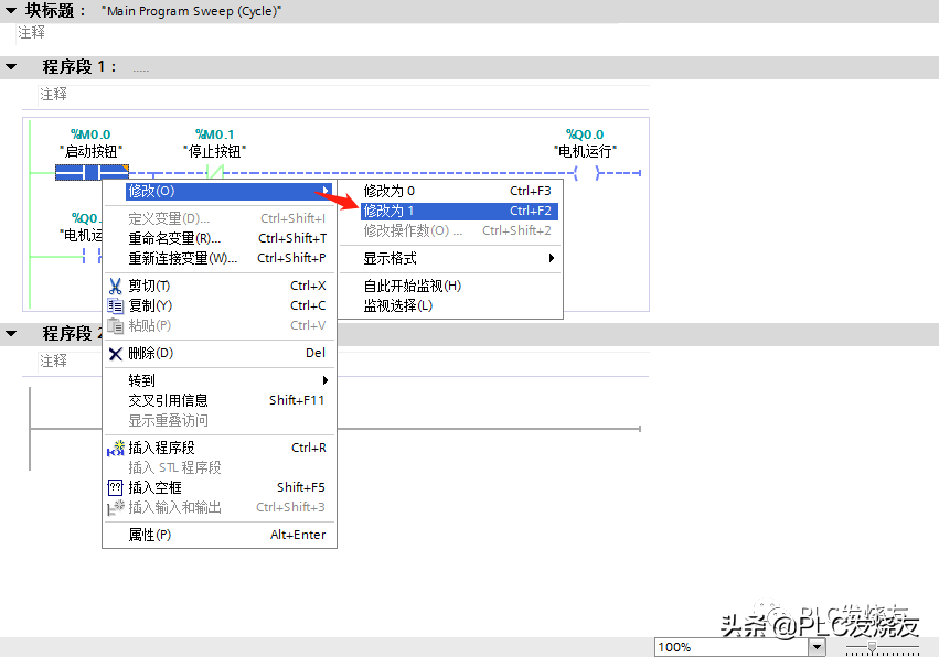 第五步:(鼠标选中停止按钮触点并右击修改—修改为1即可停止电机。)