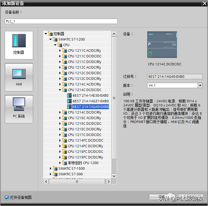 第一步:(添加一个CPU设备,这里选择1214C DC DC DC、版本V4.1)