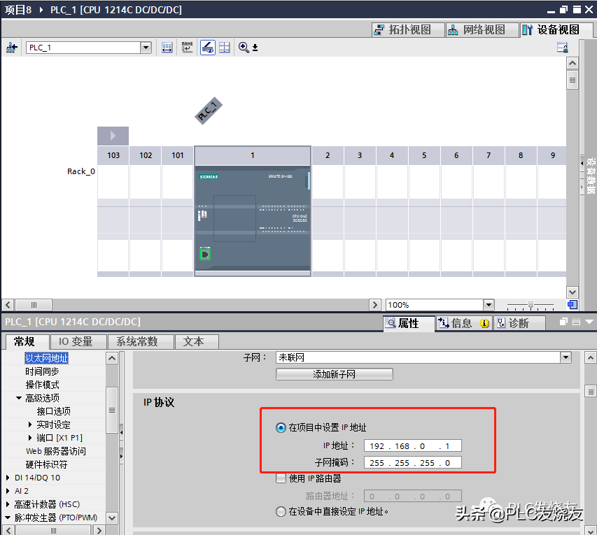 第二步:(在设备视图里选中CPU以太网网口,下方会出现PLC属性—常规—以太网地址—IP协议选中在项目中设置IP地址)