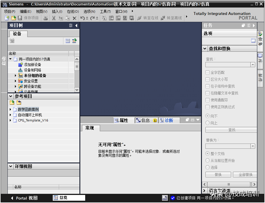 打开博途软件,新建项目,并命名为“同一项目内的S7仿真”,如图所示。