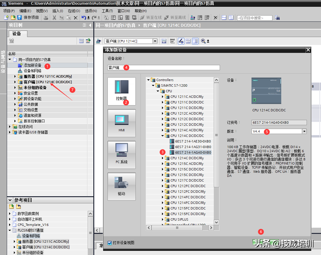 在项目树下,添加新设备,在弹出窗口选择控制器,并选择一款PLC型号,命名为“客户端”,选择固件版本号为V4.4,点击确定。