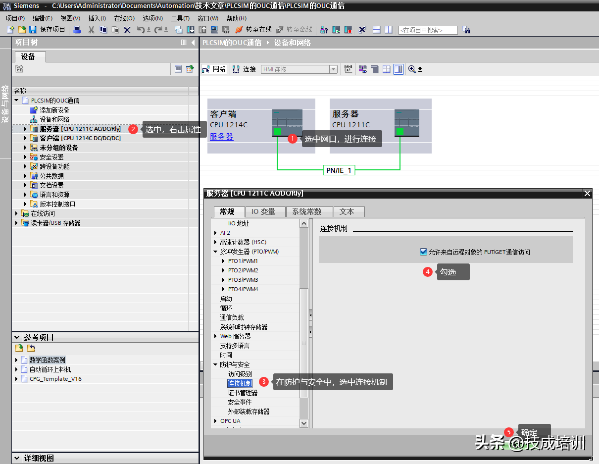 在设备和网络视图中,连接两个PLC,并PLC属性中,勾选两个PLC中的“允许来自远程对象的PUT/GET通信访问”。