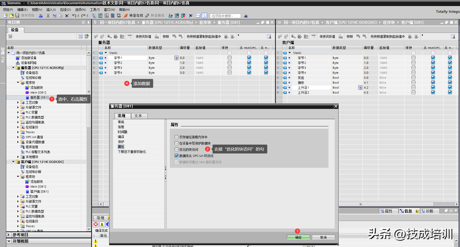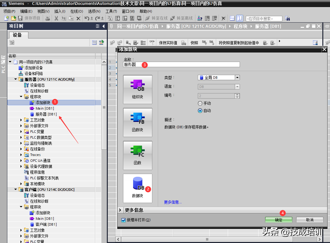 服务器:在服务器PLC的程序块下“添加新块”,选择“数据块”,命名为“服务器”,点击确定。