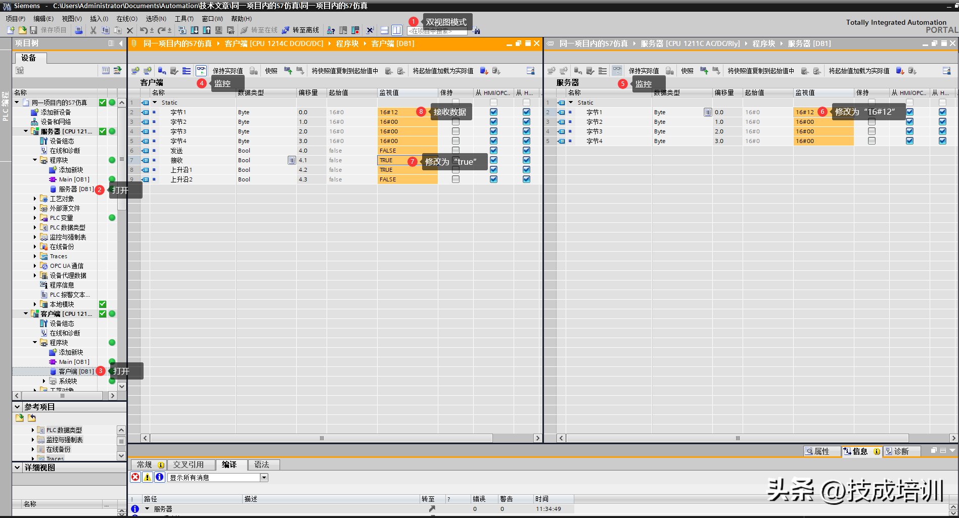 在博途项目中,选择双视图模式,并依次打开两个PLC的数据块,并进行监控。在服务中修改字节1的数据,改成十六进制的“12”,在客户端中,点击接收,可以看到客户端中的字节1数据更改为十六进制的“12”,此时则说明接收数据成功。